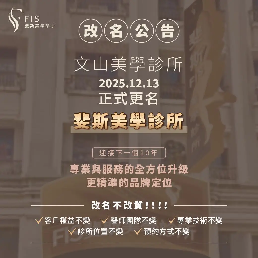 原「文山美學診所」於114年12月已將品牌進化升級換上一個更美的新名字「FIS斐斯美學診所」