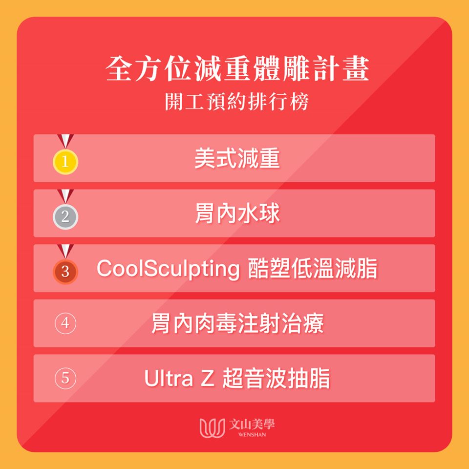 1.美式減重2.胃內水球3.CoolSculpting酷塑低溫減脂4.胃內肉毒注射治療5.Ultra Z超音波抽脂