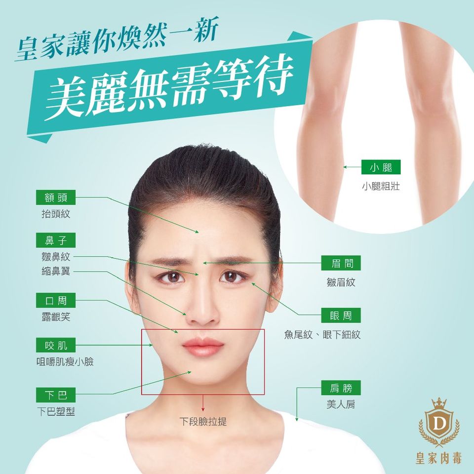 皇家肉毒來自歐洲,能夠速效除皺,瘦小臉,緊緻下半臉,也能去除虎背熊腰打造美人肩、修飾強壯蘿蔔腿打造纖細美人腿,夏天也能夠有效抑制腋下出汗讓你乾爽一整個夏天~