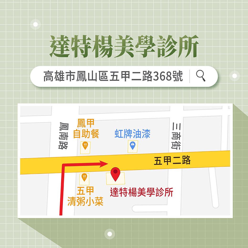 達特楊美學診所(五甲2號店)電話:07-768-6699地址:高雄市鳳山區五甲二路368、370號