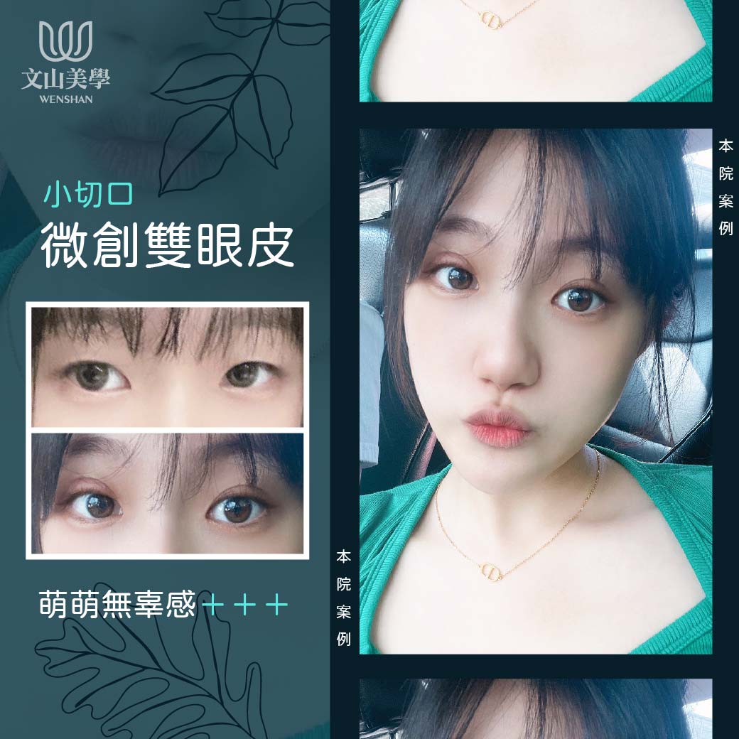 起初在『割』與『縫』之間猶豫很久,不想要有『割』的不自然感卻又想要它的持久性,也想透過雙眼皮的調整來增加萌萌無辜感,案例美眉做了許多功課後選擇了小切口微創雙眼皮。