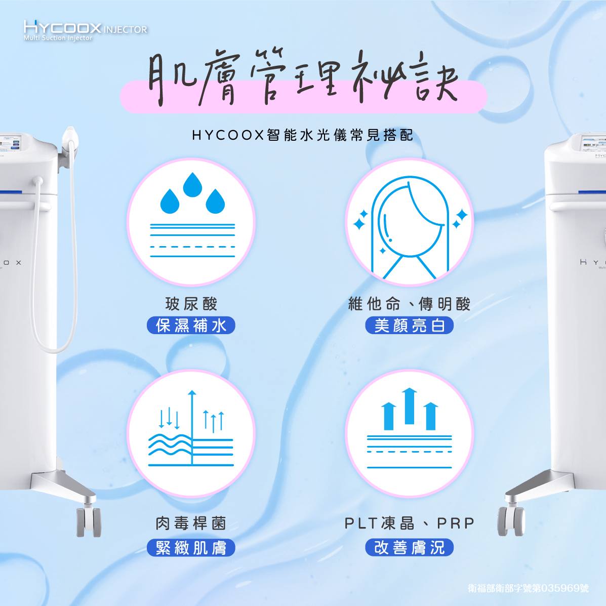 俗稱「水光槍」或「水光針」,通過台灣衛福部認證,配有高科技感知負壓自動注入系統,可依每個人的膚質情況及施打的部位,將藥劑精準的注射進真皮層,同時保濕補水、去除皺紋、收縮毛孔、滋潤角質層,再現肌膚青春。看更多說明:https://shorturl.at/YQfsm