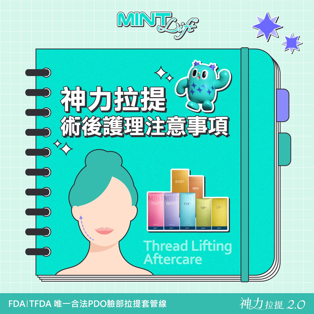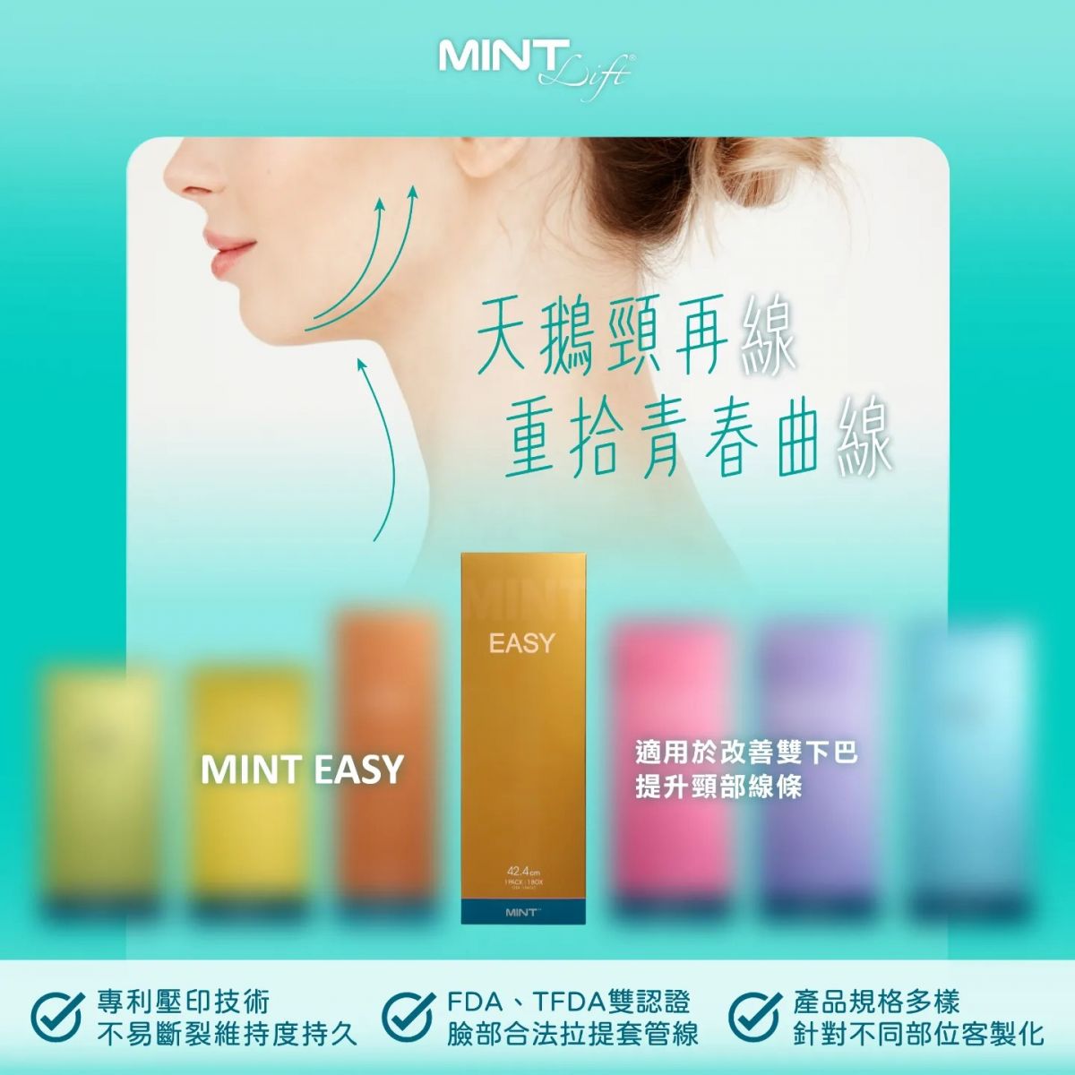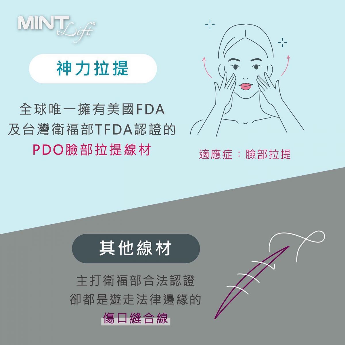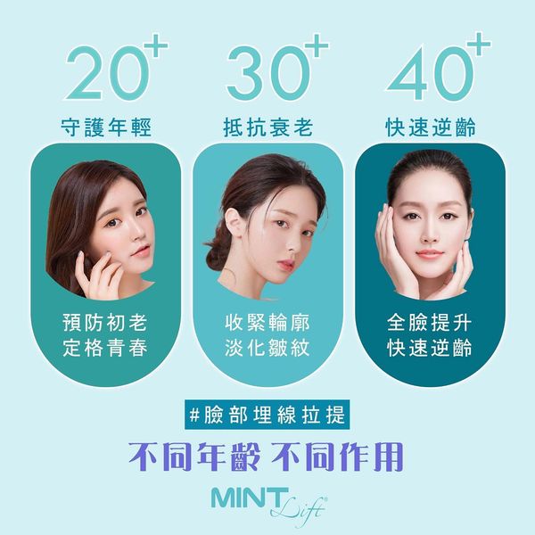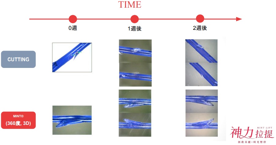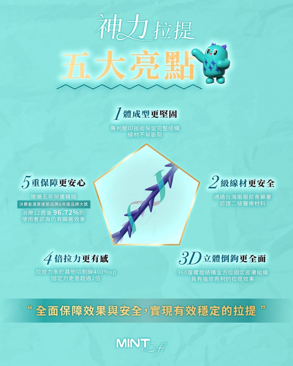 MINT LIFT使用可被人體吸收的PDO(聚對二甲基羥已酮),利用微創技術將拉提線埋在髮際線內,傷口小且不明顯,並透過特殊設計的3D立體倒鉤均勻施力在皮下組織,並刺激膠原蛋白。