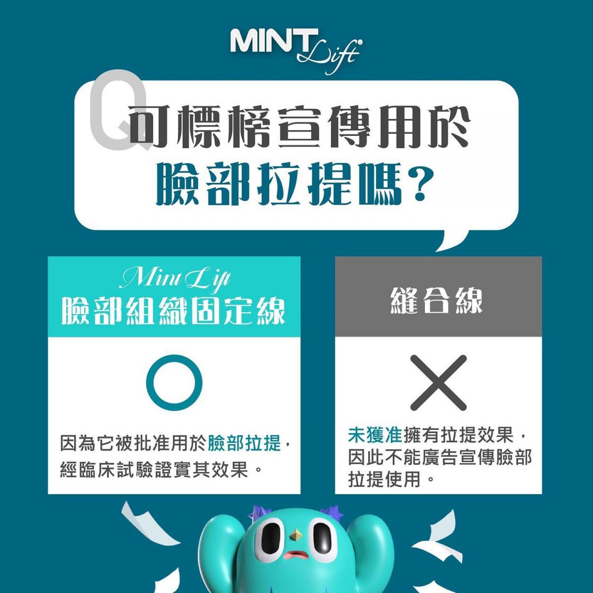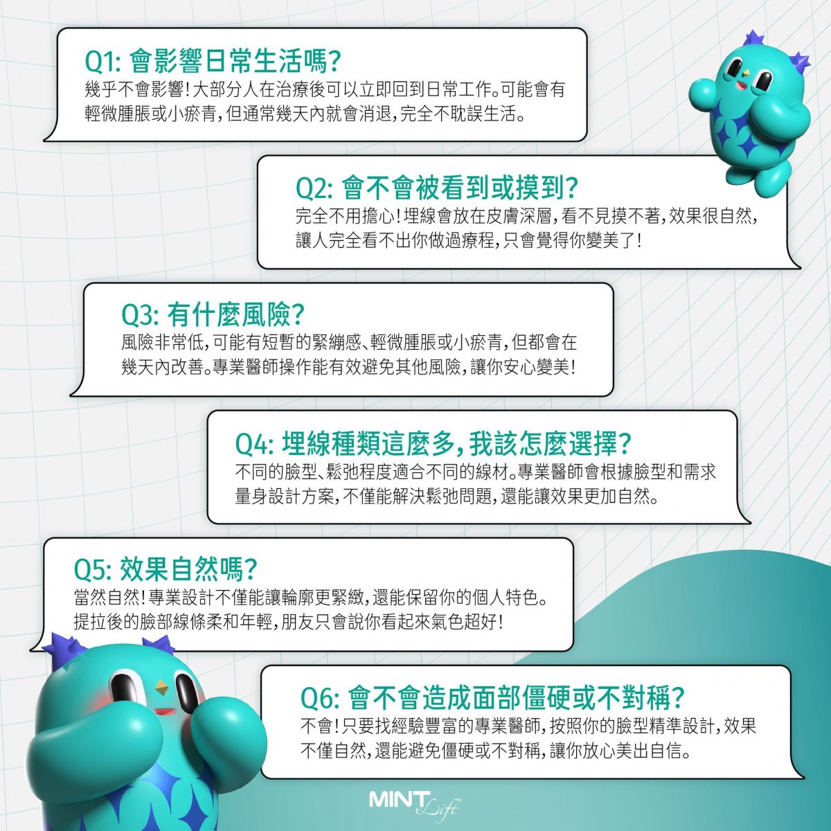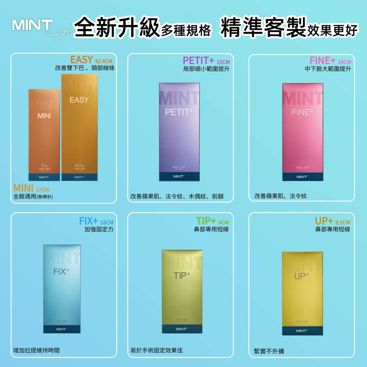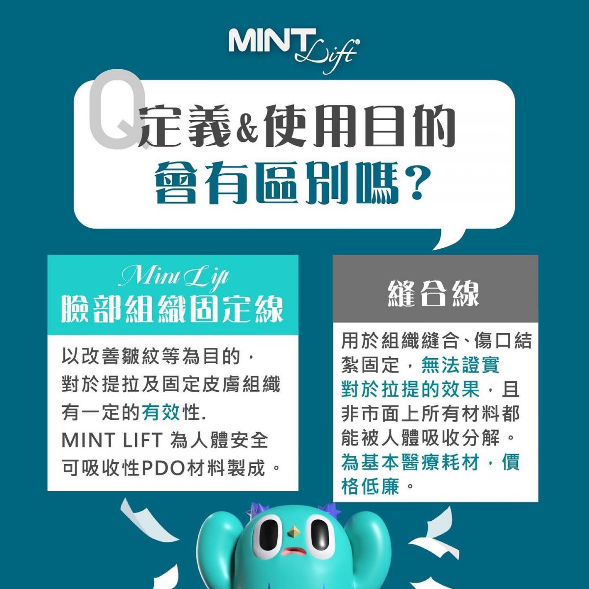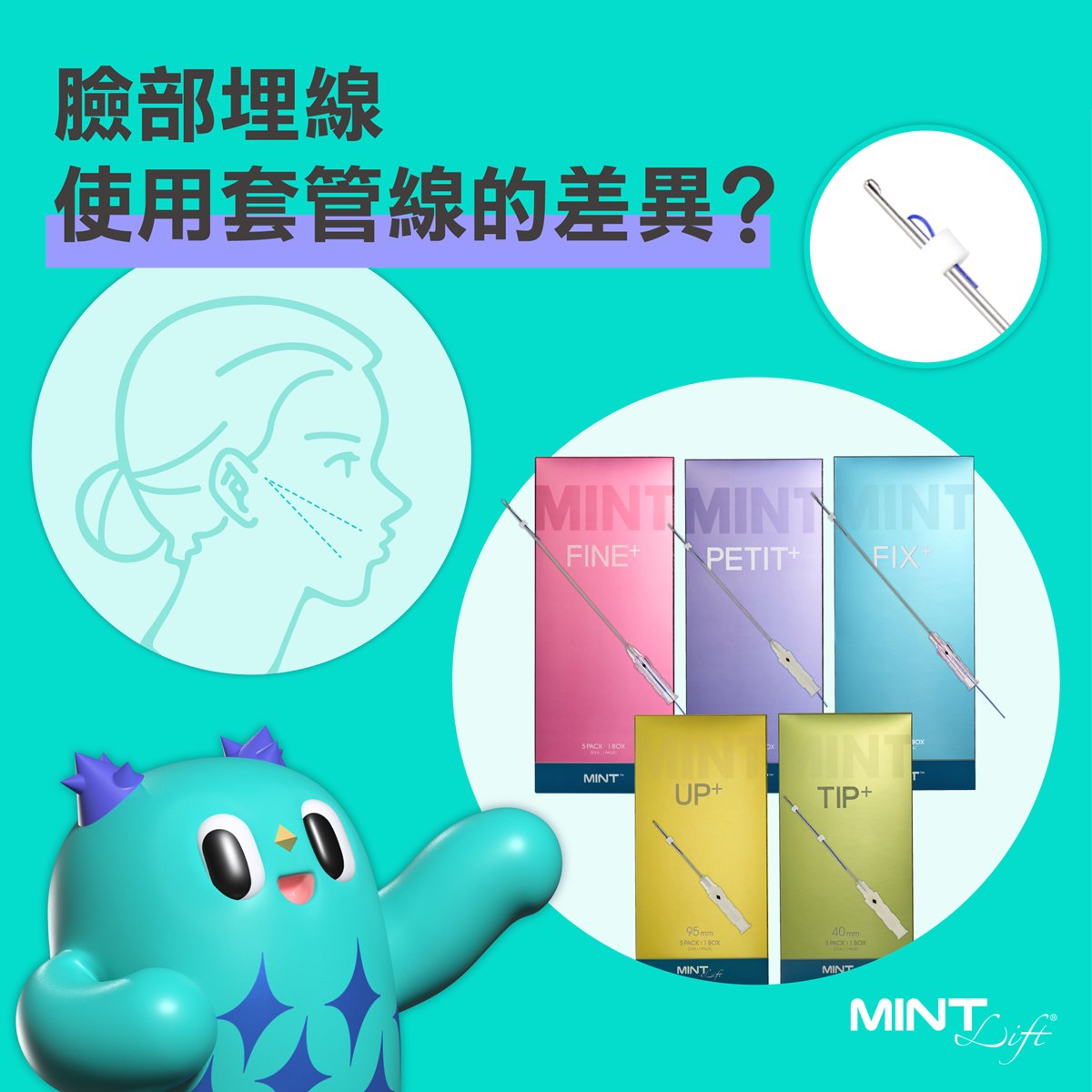MINT LIFT使用可被人體吸收的PDO(聚對二甲基羥已酮),利用微創技術將拉提線埋在髮際線內,傷口小且不明顯,並透過特殊設計的3D立體倒鉤均勻施力在皮下組織,並刺激膠原蛋白。