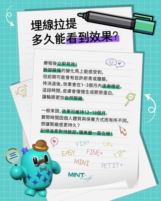約六個月後,MINI線材將逐漸被人體吸收,而增加的膠原蛋白則將原本鬆弛下垂的部位自然拉提,添增澎潤感,達到更持久的效果!