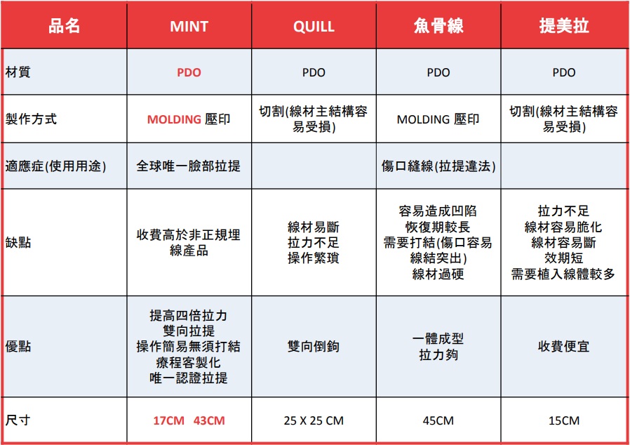 韓士秘特拉提線 - MINT LIFT 神力拉提與其他線材的比較: