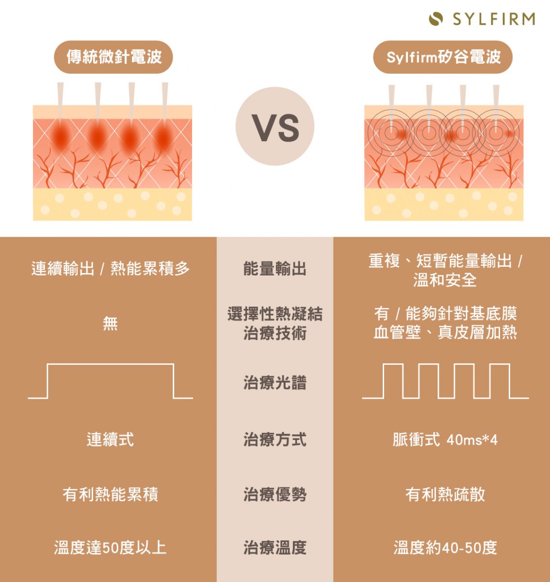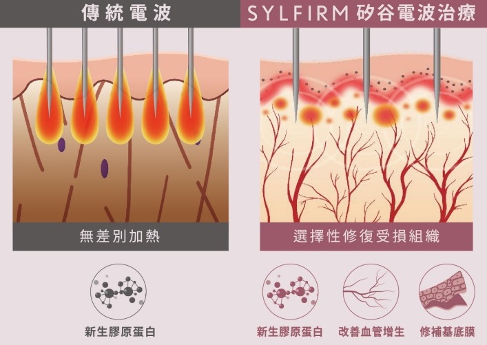 Sylfirm矽谷電波由美國矽谷研發團隊所設計,不同於傳統電波的「非選擇性」破壞,Sylfirm矽谷電波具備專利的脈衝式熱能輸出模式,可以「選擇性」讓熱能精準通過目標組織給予治療,像是基底膜、血管壁以及真皮層受損的纖維母細胞等,針對受損的皮膚組織進行修復,刺激皮膚的膠原蛋白新生。