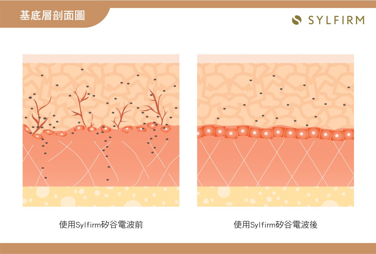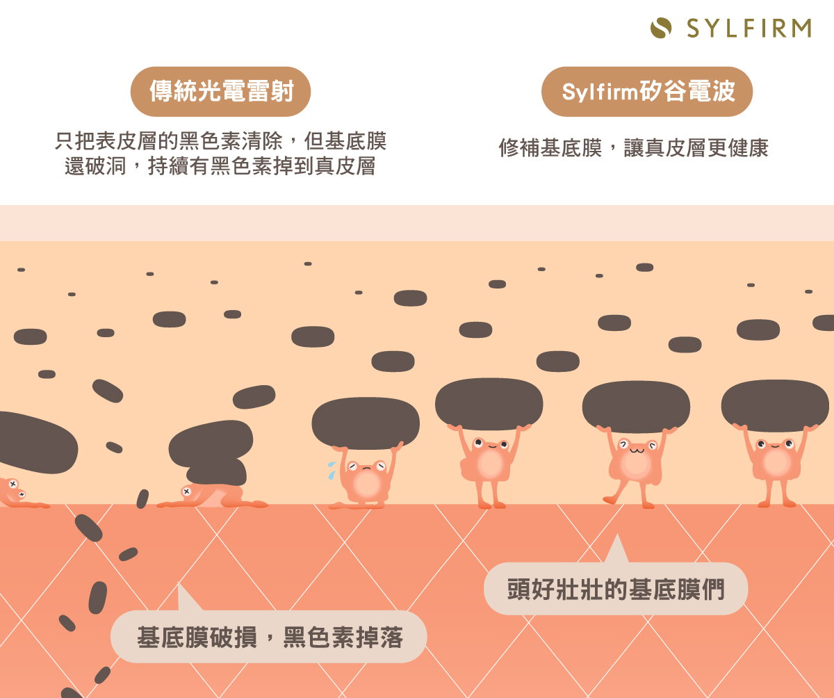 若將肝斑比喻成劣質商品,只擊碎表面黑色素細胞,如同沒有從源頭控管品質,劣質商品能持續被製造,因此Sylfirm矽谷電波就如同在源頭控管,重建肌膚厚度、養好肌膚防禦力,才能達到肝斑最好的治療。
