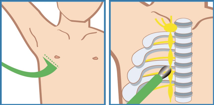 內視鏡交感神經切除手術需要在兩側腋下各開一個約0.7cm的切口,接著利用內視鏡進入胸腔﹐將橫隔膜第二截跟第三截中間的交感神經做切口燒灼後﹐再讓肺部恢復正常擴張﹐最後將傷口縫合即完成手術,手術全程會進行全身麻醉。