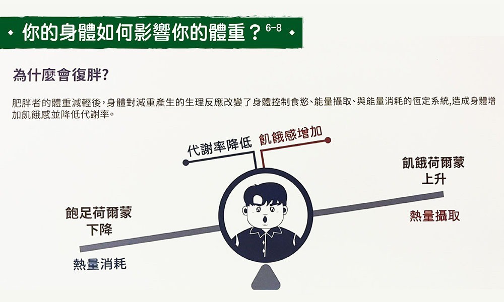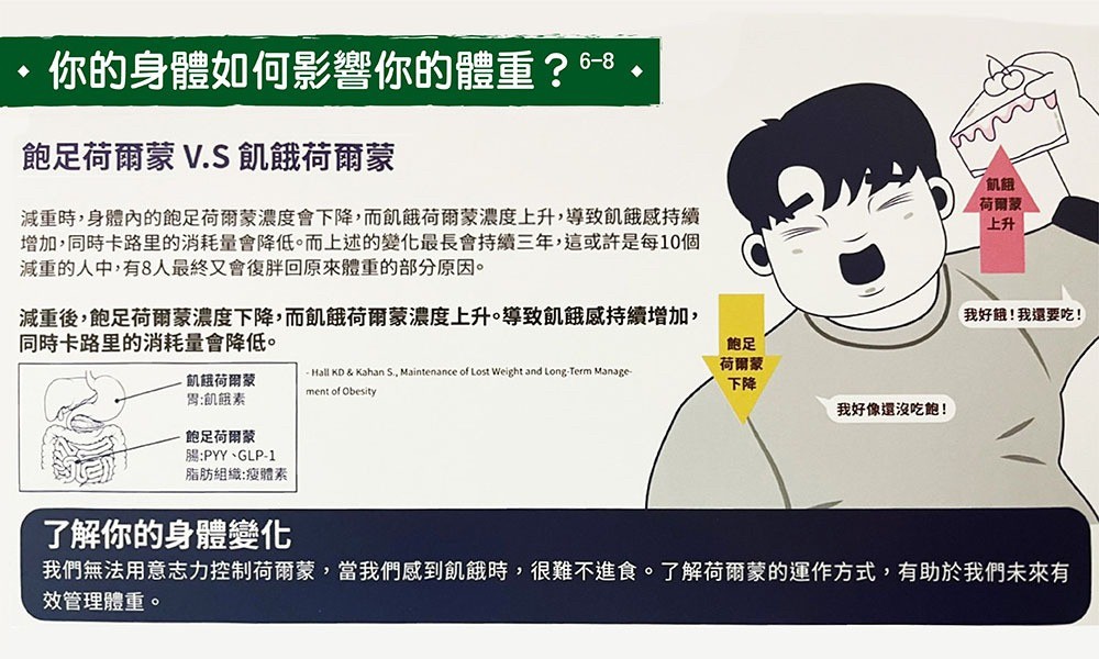 對於肥胖症患者,減重會改變影響食慾的荷爾蒙濃度。體重減輕後,身體會想嘗試恢復原本的體重,自然而然地會增加飢餓感,並減少熱量消耗。也就是說,雖然您努力地透過飲食和運動來減重,但身體卻反其道而行,抵銷您所做的努力,這就是為什麼減重和維持體重這麼困難!
