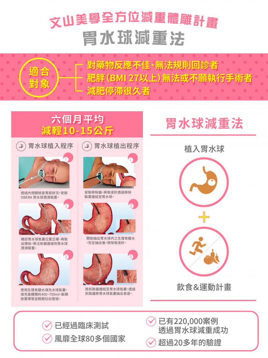 將水球藉由胃鏡置入胃中,再將生理食鹽水注入水球內,藉由水球填充胃部產生飽足感, #以降低食物攝取量的方式達到減重效果。