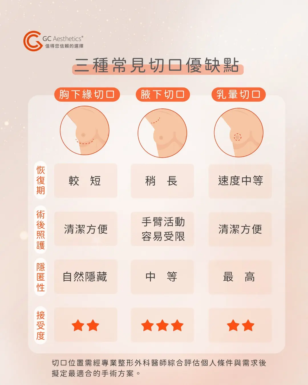 手術切口的選擇需與專業醫師充分討論,同時也須評估妳的生活習慣與需求,才能打造最安心又滿意的效果!
