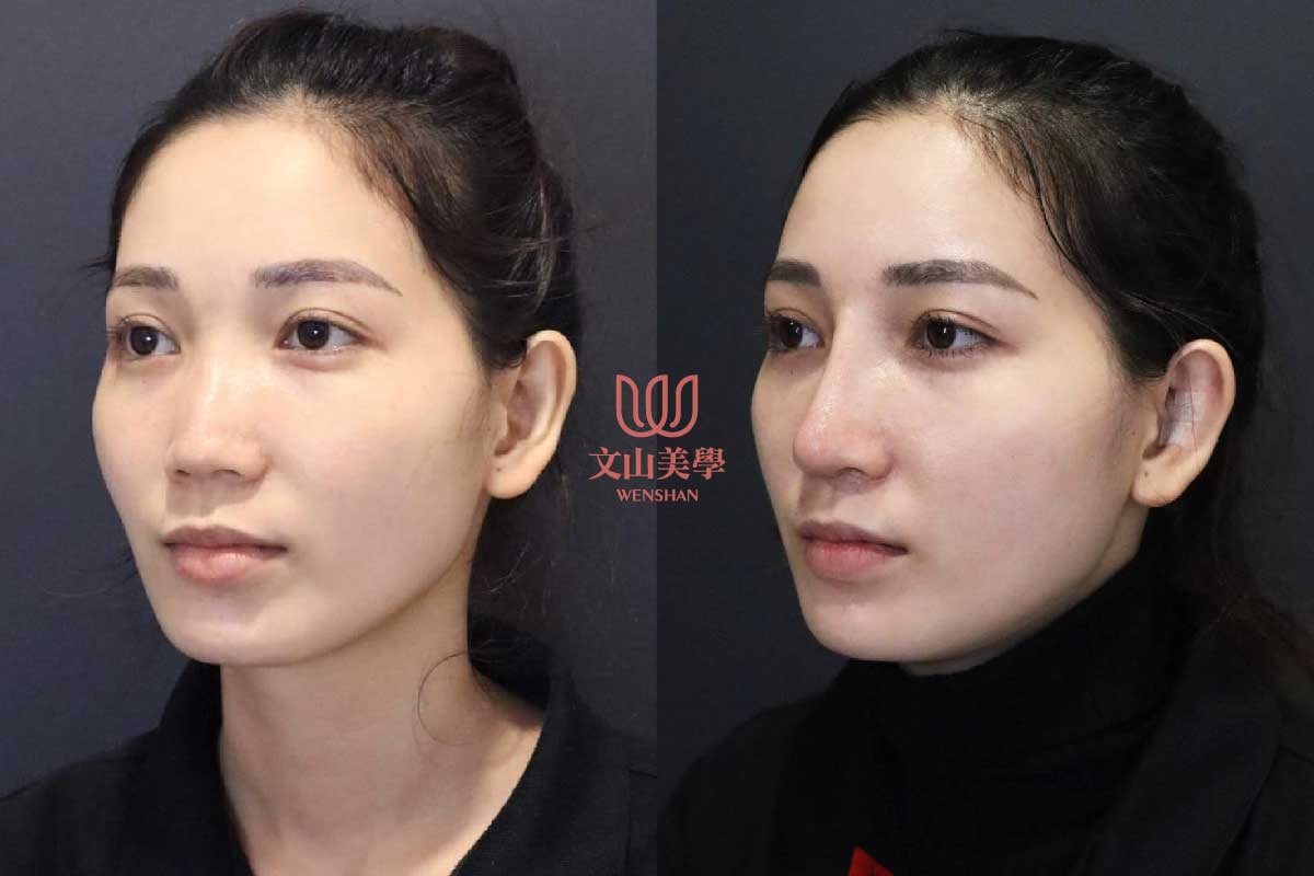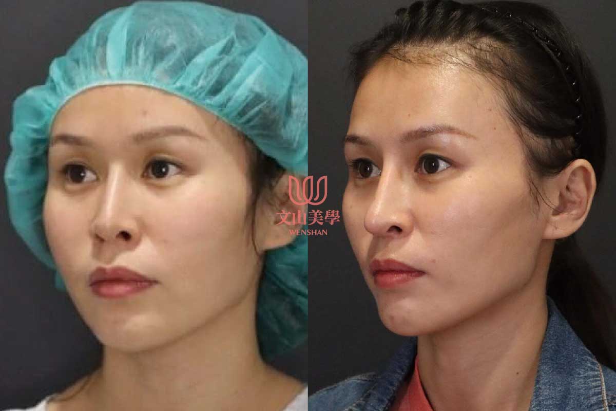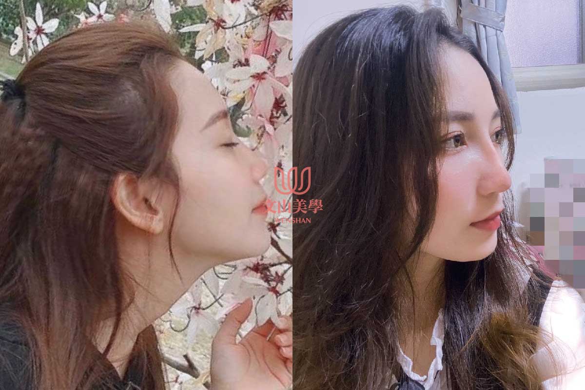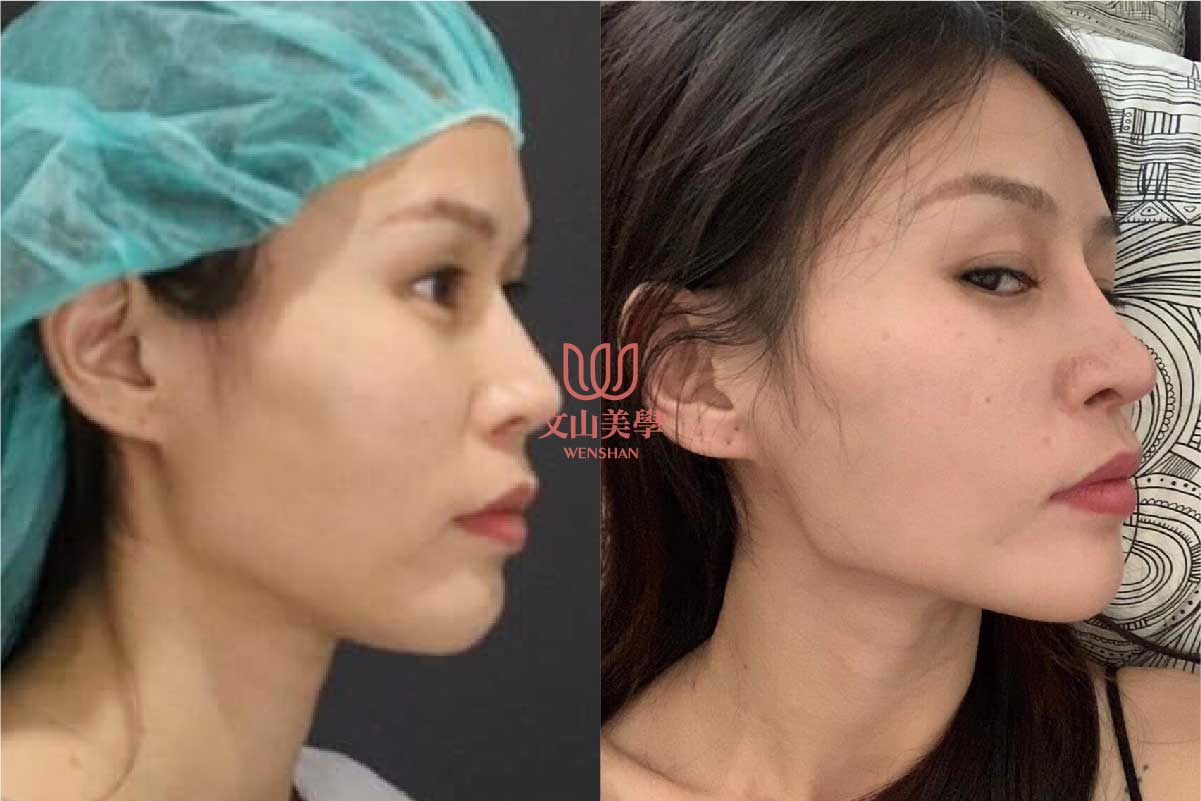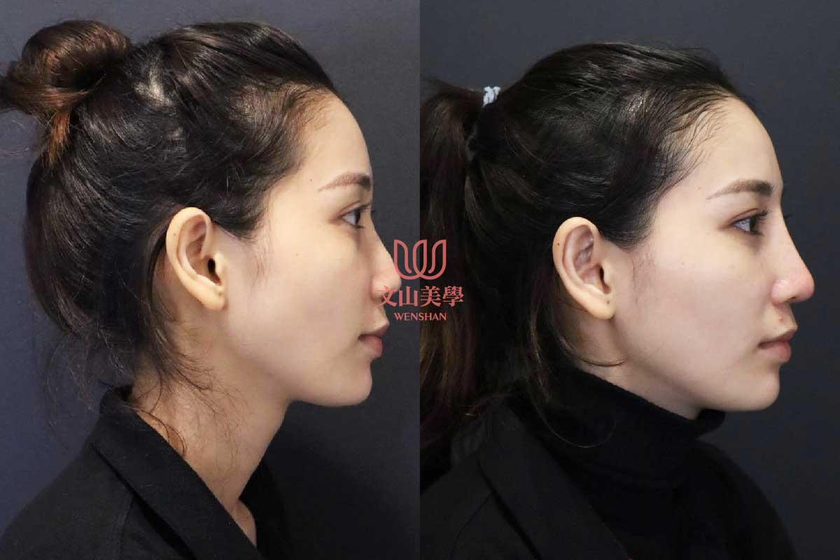 這位美眉透過三段式隆鼻改善了鼻柱不順暢的問題,原先的鼻型讓美眉看起來比較剛烈,三段式隆鼻手術(又稱為複合式、結構式隆鼻),透過假體或自肋墊高延長鼻梁,再取適合的耳軟骨來撐起鼻頭的部分,讓鼻尖能更好的塑形也能有保護鼻頭不被鼻模刺穿的風險,延長鼻中膈軟骨的部分,讓鼻型更加挺拔。三段式隆鼻手術過程比較繁瑣且環環相扣,非常考驗醫師的技術及美感,全方位的考量才能朔造出客製化的理想鼻型。