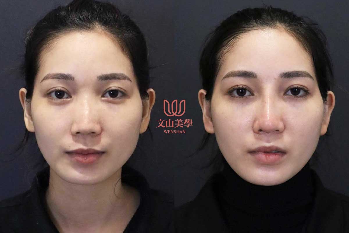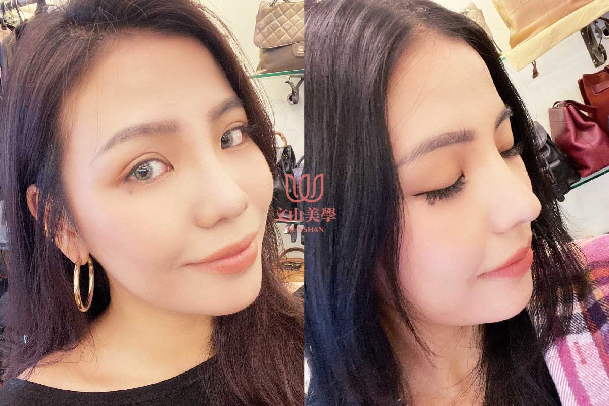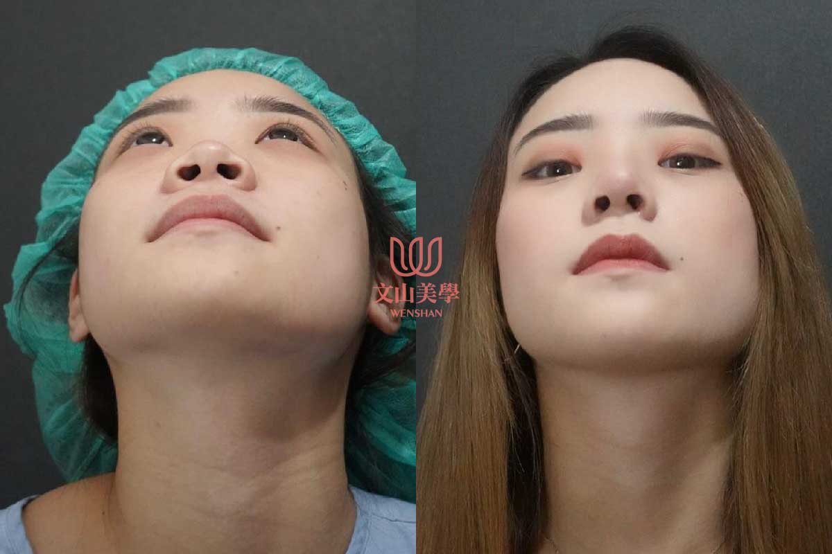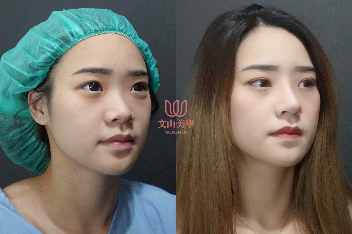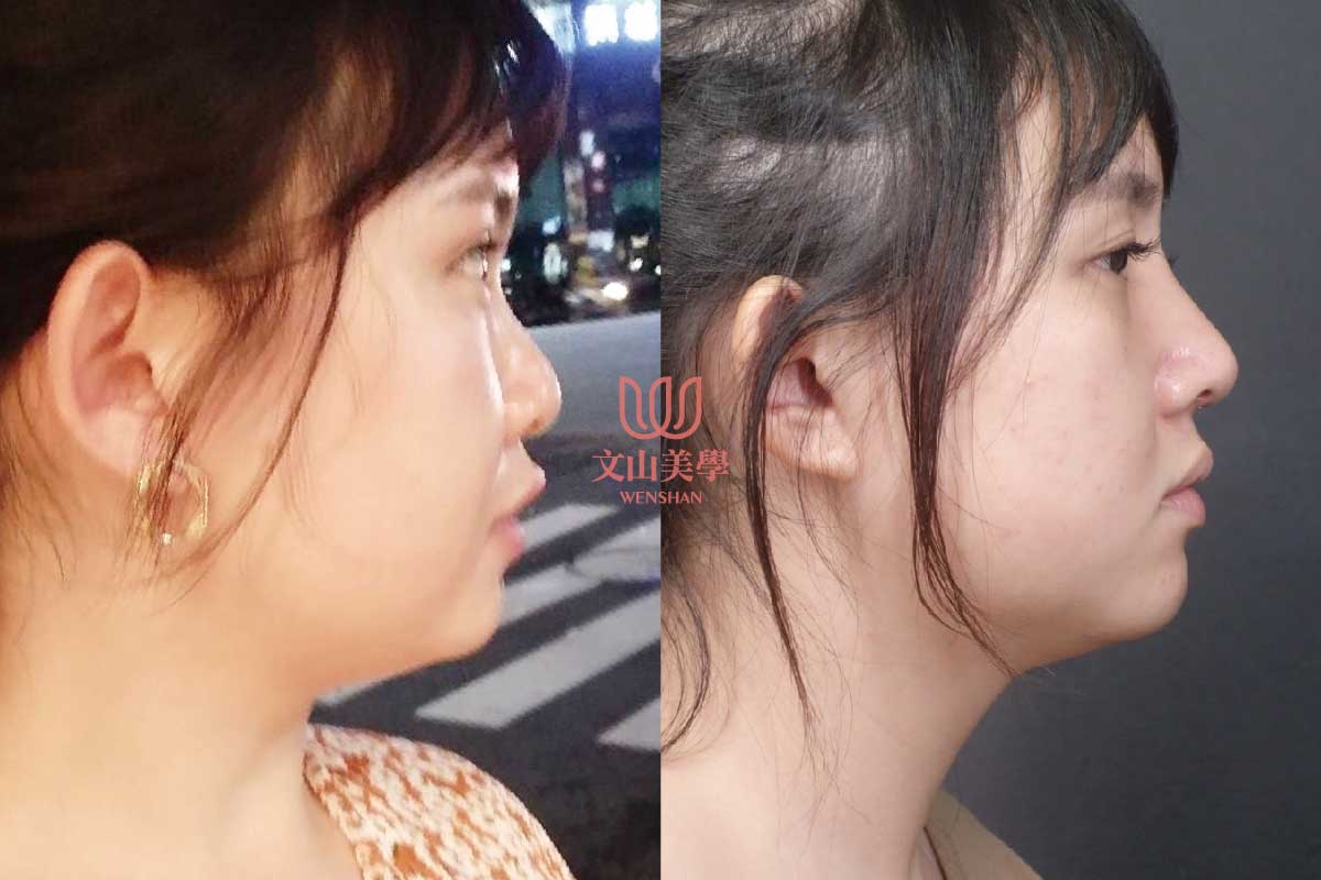 這位美眉透過三段式隆鼻改善了鼻柱不順暢的問題,原先的鼻型讓美眉看起來比較剛烈,三段式隆鼻手術(又稱為複合式、結構式隆鼻),透過假體或自肋墊高延長鼻梁,再取適合的耳軟骨來撐起鼻頭的部分,讓鼻尖能更好的塑形也能有保護鼻頭不被鼻模刺穿的風險,延長鼻中膈軟骨的部分,讓鼻型更加挺拔。三段式隆鼻手術過程比較繁瑣且環環相扣,非常考驗醫師的技術及美感,全方位的考量才能朔造出客製化的理想鼻型。