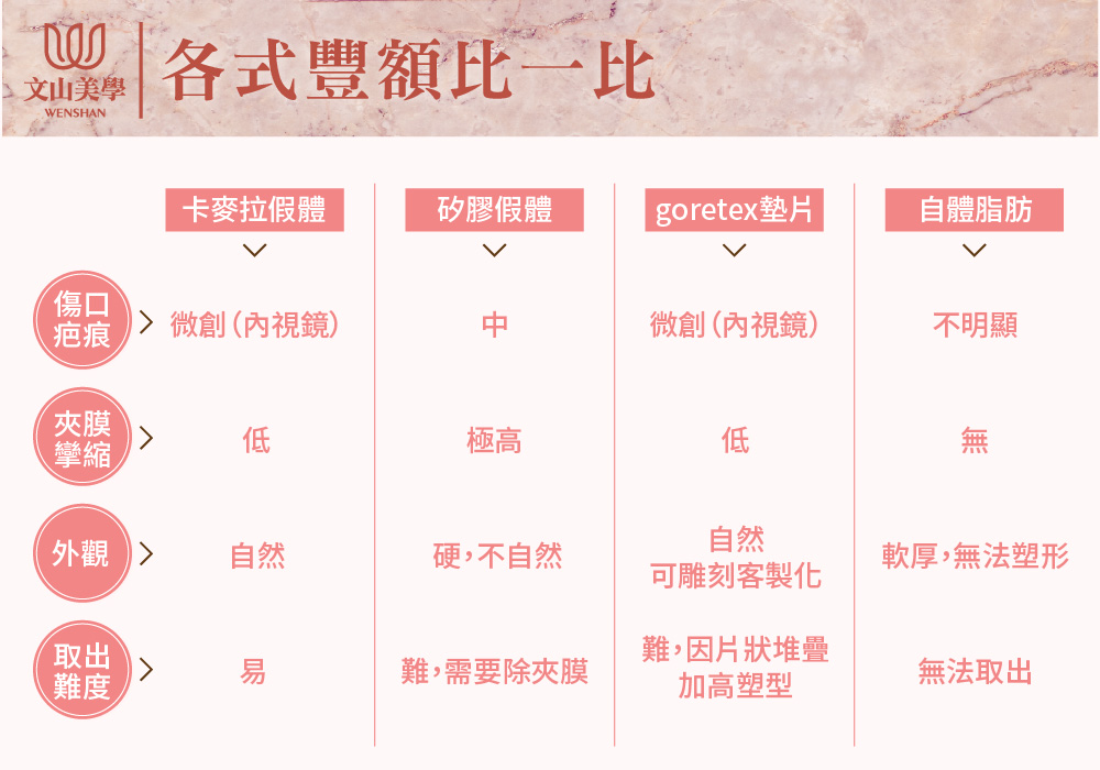 卡麥拉(Chimera)外層是ePTFE聚四氟乙烯,為人工血管材質,可降低與人體相容性不佳,表面充滿很多細小孔隙,身體組織會長入這些孔隙,因而比較不會位移及形成夾膜攣縮,其內部為矽膠材質,結合兩種材質的優點融合一體,可以讓鼸模保有自然支撐彈性、更挺、更有型。