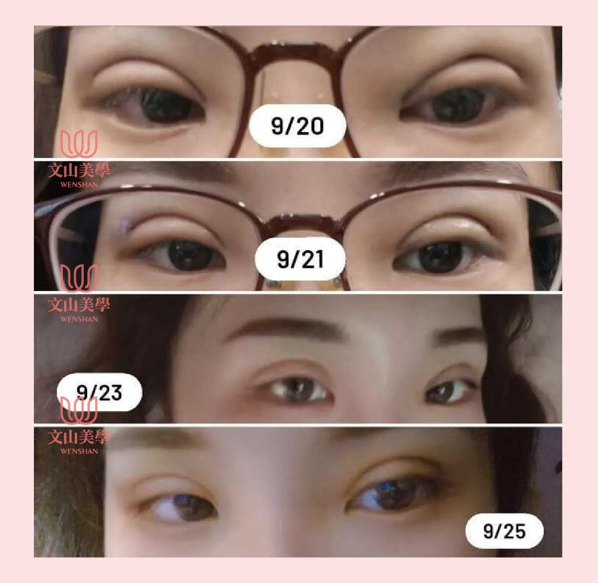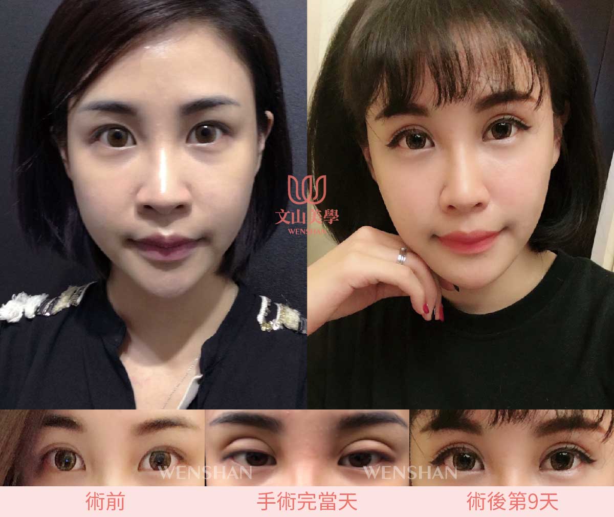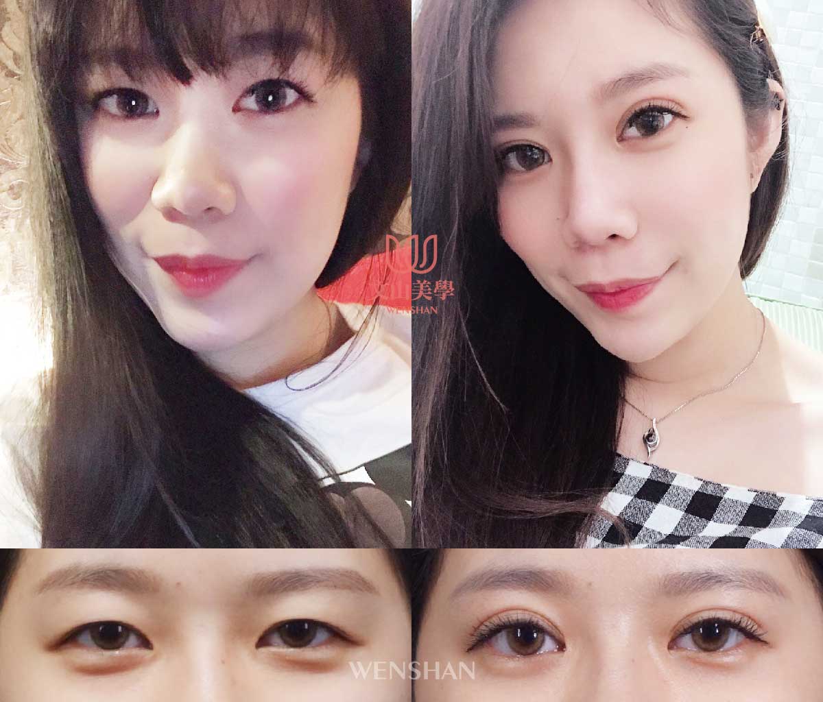仿間大都流行:縫式雙眼皮、半開割式雙眼皮、割式雙眼皮、日式訂書針縫法、提眉手術、提眼肌、眼袋等消除。其中雙眼皮是文山美學最自豪的技術。