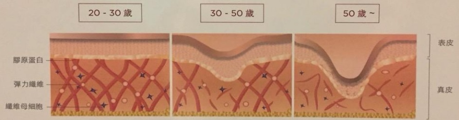 隨著年齡的增長,老化斷裂的膠原蛋白無法交聯膠原蛋白基質,使得纖維母細胞的活力減退。加上平均每年約流失1%的膠原蛋白,導致皮膚膠原蛋白的產生速度比不上流失的速度,肌膚的支撐力將變得不足,漸漸失去彈性、深淺皺紋、鬆弛下垂等老化現象也隨之出現。