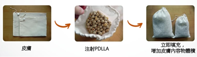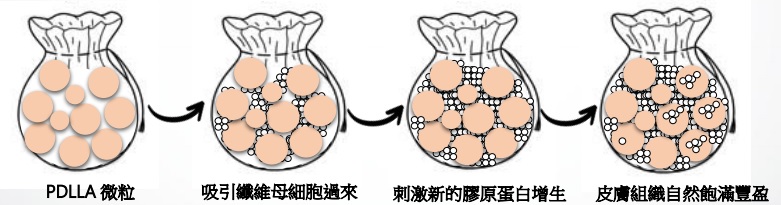 PDLLA 多孔性微球體,可吸引纖維母細胞進來,刺激自體膠原蛋白的增生。