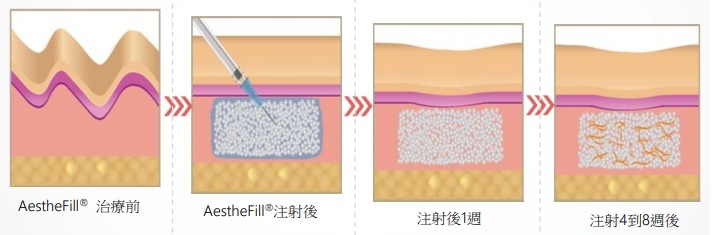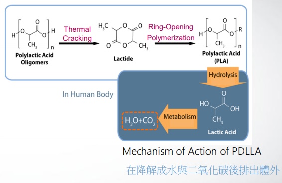 隨著時間的推移,AestheFill® 在體內逐漸分解成乳酸和糖原之後,再通過體內代謝作用,最終分解為水和二氧化碳的形態排出體外,所以具有安全性。是無毒性的安全材料。