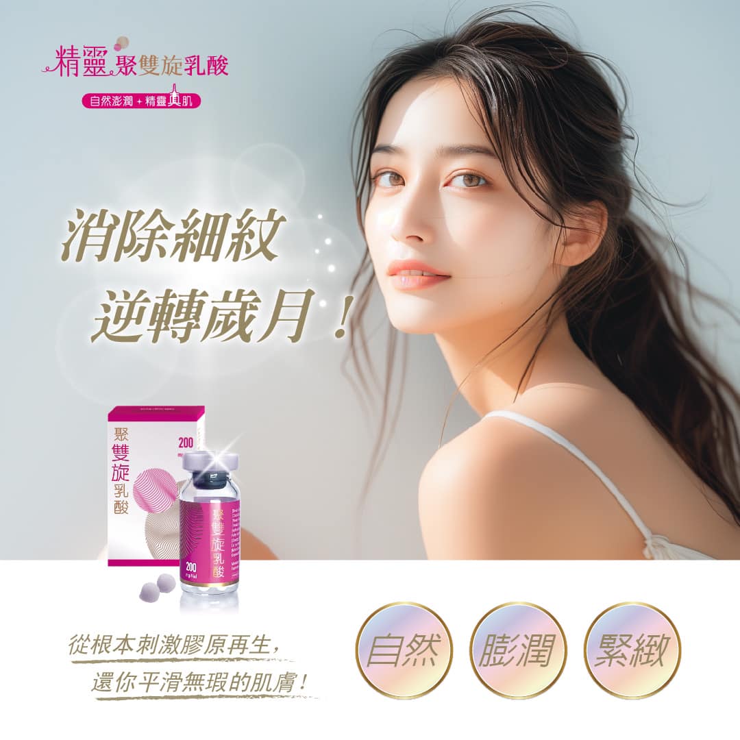 精靈聚雙旋乳酸注入皮膚後會釋放乳酸分子,溫和啟動膠原蛋白增生機制,幫助填補凹陷、撫平細紋,讓肌膚逐漸恢復彈性與緊實