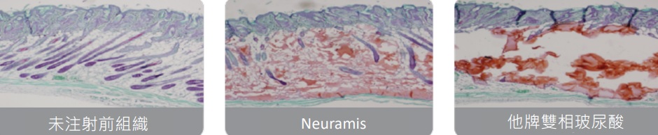 在病理切片下,Neuramis 顯示出良好的皮膚相容性與耐受度,注射後與皮膚周圍的組織很好地融合,呈現自然外觀。