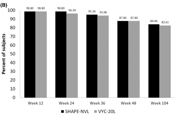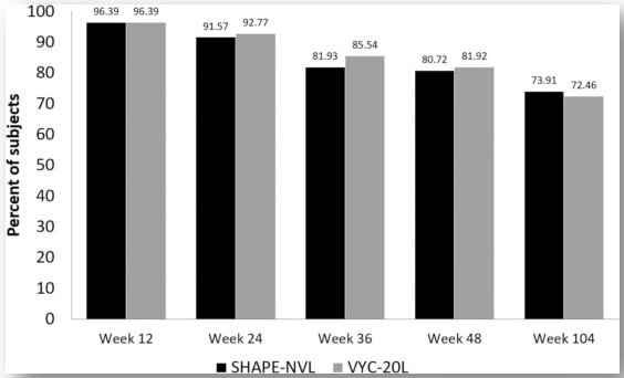 結果顯示在24週時,醫師評估NVL 仍有100% 有效高反應率,受試者評估亦有96.4%的反應率,與對照組VYC-20L 在統計學意義上沒有差異。