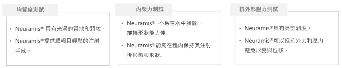 Neuramis® Volume Lidocaine具良好膠體內聚力,因此預期注射後在體內保持形態和形狀的能力也較佳 。