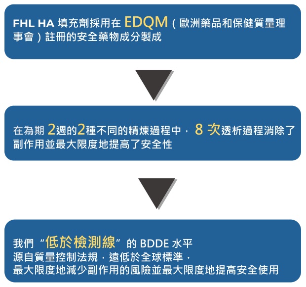 FHL開發 Diamold Technique有兩個目的:去除雜質和交聯劑,並盡力減少注射後所產生的過度膨脹。