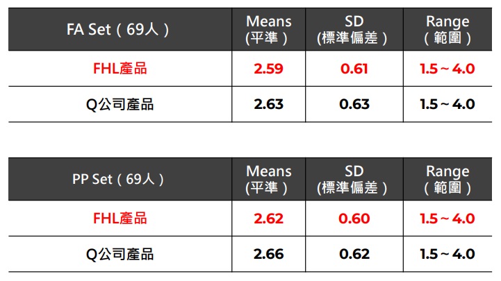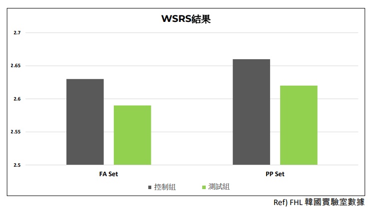 6個月後皺紋嚴重程度視覺評估(WSRS)結果——數字越低,皺紋越輕 FHL的產品比Q公司的產品優0.04