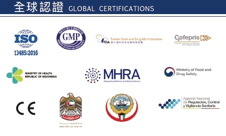 製造基地規模和設備完善,擁有韓國KFDA、台灣TFDA、歐盟CE的全球多國認證