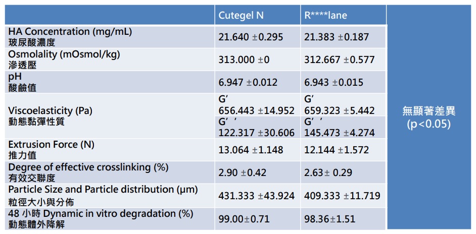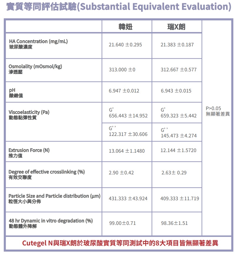 珂蒂婕玻尿酸Cutegel N 與R牌玻尿酸進行實質等同比對試驗結果各項數據皆無顯著差異