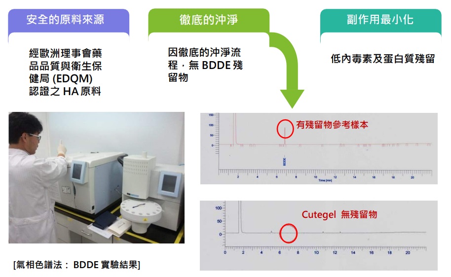 CUTEGEL 通過韓國臨床安全度及耐久度測試過的安全產品,包括有效交聯度測試在台北醫學大學完成。
