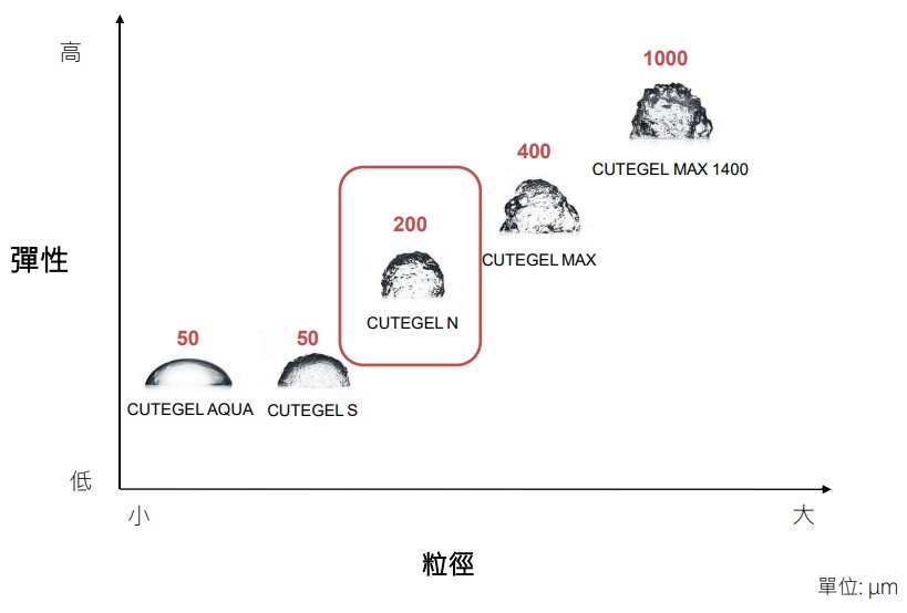 粒徑大小比較圖- 珂蒂婕玻尿酸 Cutegel N 為中分子玻尿酸