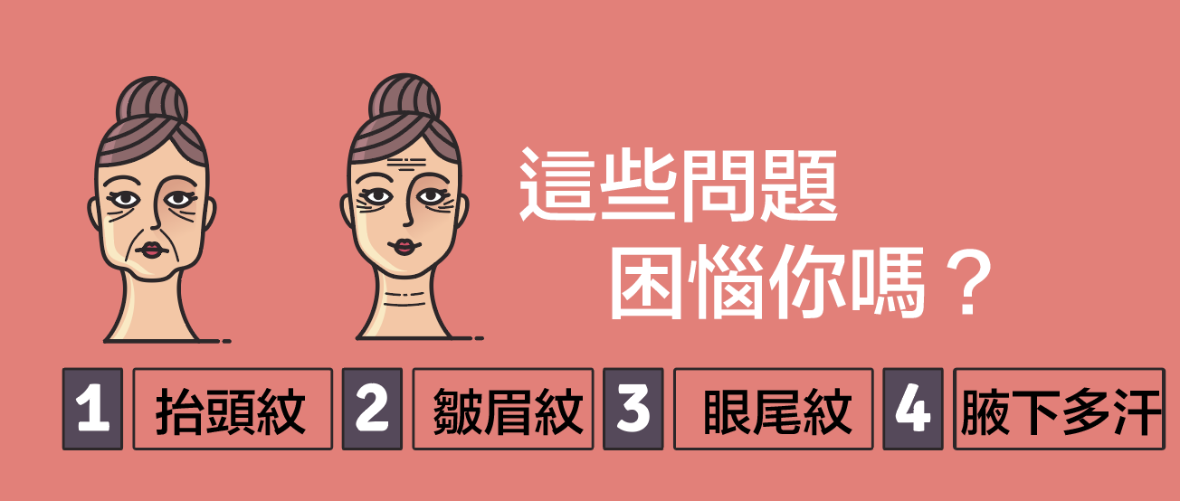 •改善成人上臉部因抬頭紋、皺眉紋、魚尾紋所造成的動態性皺紋外觀。