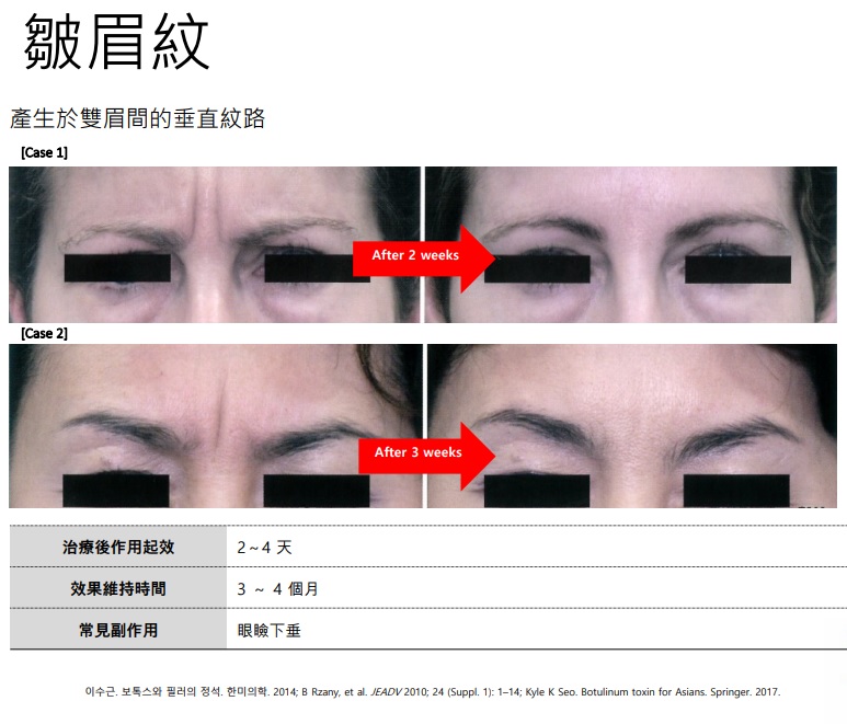 A:暫時改善因皺眉肌及(或)鼻眉肌活動造成的中度至重度皺眉紋外觀。
