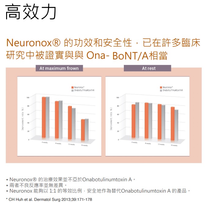 A:Neuronox®是韓國醫美生技大廠Medytox所研發出的,第一個韓國肉毒桿菌素品品牌。它是 由肉毒桿菌所分泌、純化萃取而成的蛋白質,經由抑制神經末梢訊息釋放,達到放鬆肌肉、減 少肌肉過度活躍、拉扯。使皮膚恢復平滑,並且預防皮膚產生新的細紋皺紋。