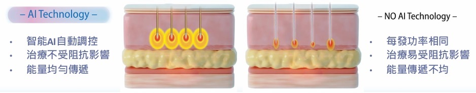 ◼ 獨家AI單極電波(AI Technology)毫秒內達成阻抗監測回饋,自動調整脈衝持續時間。簡化治療步驟,能量精準且舒適度高。