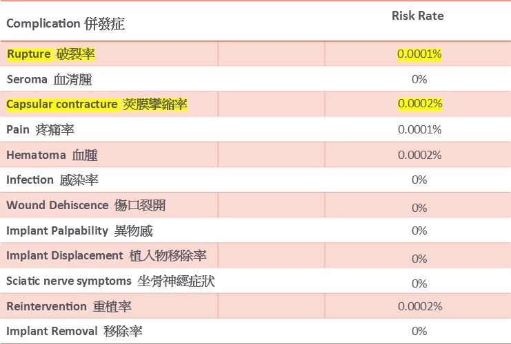 ♦破裂時免費更換植入物。